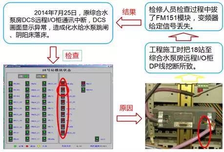 2014年7月25日,原綜合水泵房DCS遠程I/O柜通訊中斷,DCS畫面顯示異常,造成化水給水泵跳閘、陰陽床落床。