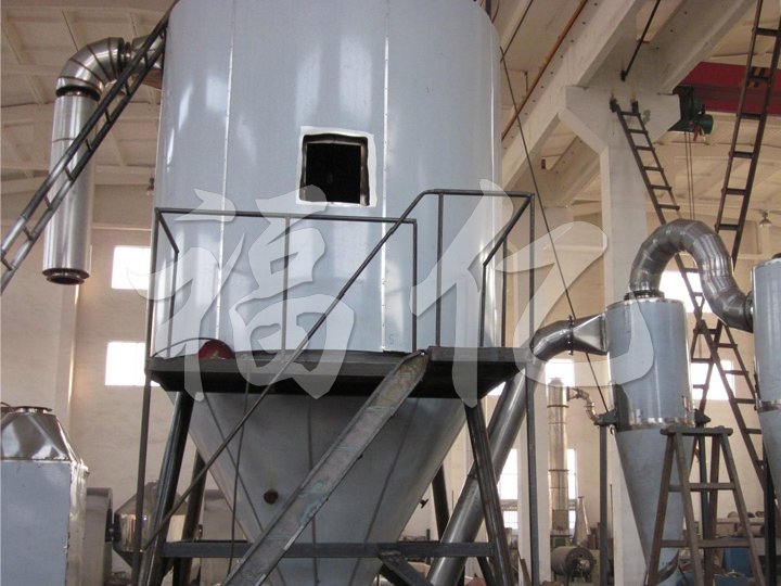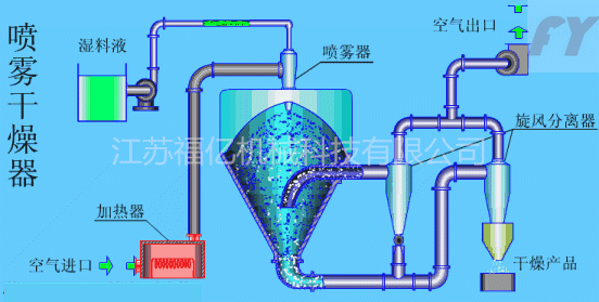 空氣經過濾和加熱,進入干燥器頂部空氣分配器,熱空氣呈螺旋狀均勻地進入干燥室。料液經塔體頂部的高速離心霧化器,(旋轉)噴霧成極細微的霧狀液珠,與熱空氣并流接觸在極短的時間內可干燥為成品。成品連續地由干燥塔底部和旋風分離器中輸出,廢氣由風機排空。