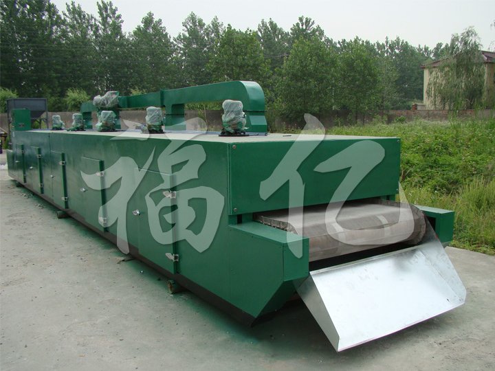 物料由加料器均勻地鋪在網帶上,網帶一般采用12-60目不銹鋼絲網,由傳動裝置拖動在干燥機內移動。干燥機由若干單元組成,每一單元熱風獨立循環,部分尾氣由專門排濕風機排出,廢氣由調節閥控制,熱氣由下往上或由上往下穿過鋪滿物料的網帶完成熱量與質量傳遞的進程,帶走物料水份。網帶緩慢移動,運行速度可根據物料溫度自由調節,干燥后的成品連續落入收料器中。上下循環單元根據用戶需要可靈活配備,單元數量亦可根據需要選取。
