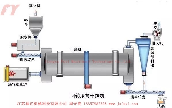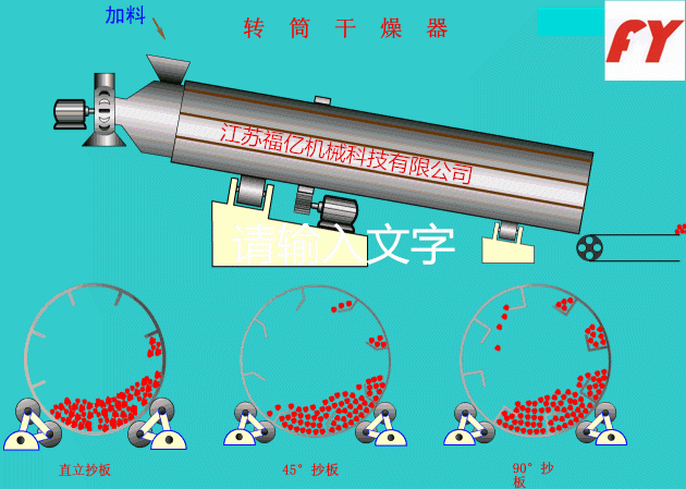 濕物料從干燥機一端投入后,在內(nèi)筒均布的抄板器翻動下,物料在干燥器內(nèi)均勻分布與分散,并與并流(逆流)的熱空氣充分接觸,加快了干燥傳熱,傳至推動力。在干燥過程中,物料在帶有傾斜度的抄板和熱氣流的作用下,可調(diào)控地運動至干燥機另一段星形卸料閥排出成品。