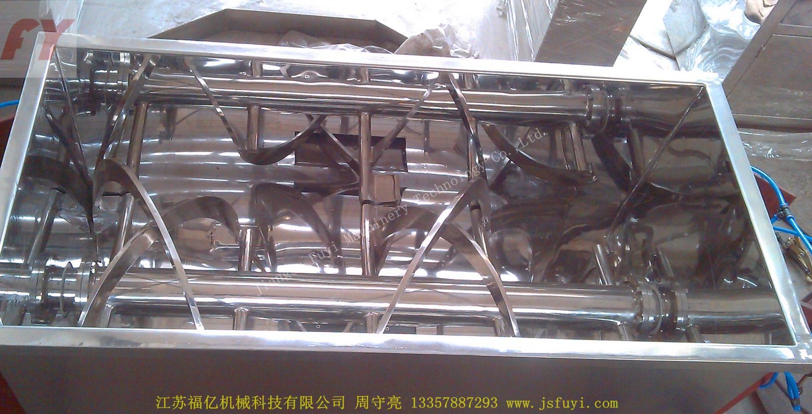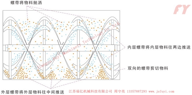 攪拌器軸,外螺旋帶在動(dòng)力的驅(qū)動(dòng)下,其盤繞形式配合旋轉(zhuǎn)方向把物料從U型倉兩端向中央地帶推動(dòng),而內(nèi)螺旋帶把物料從中間向兩端推動(dòng),形成對(duì)流混合。混合機(jī)臥式筒體底部中央開設(shè)出料口,外層螺旋帶的蝸旋結(jié)構(gòu)配合主軸旋轉(zhuǎn)方向驅(qū)趕筒壁內(nèi)側(cè)物料至中央出料口出料,確保筒體內(nèi)物料出料無死角。