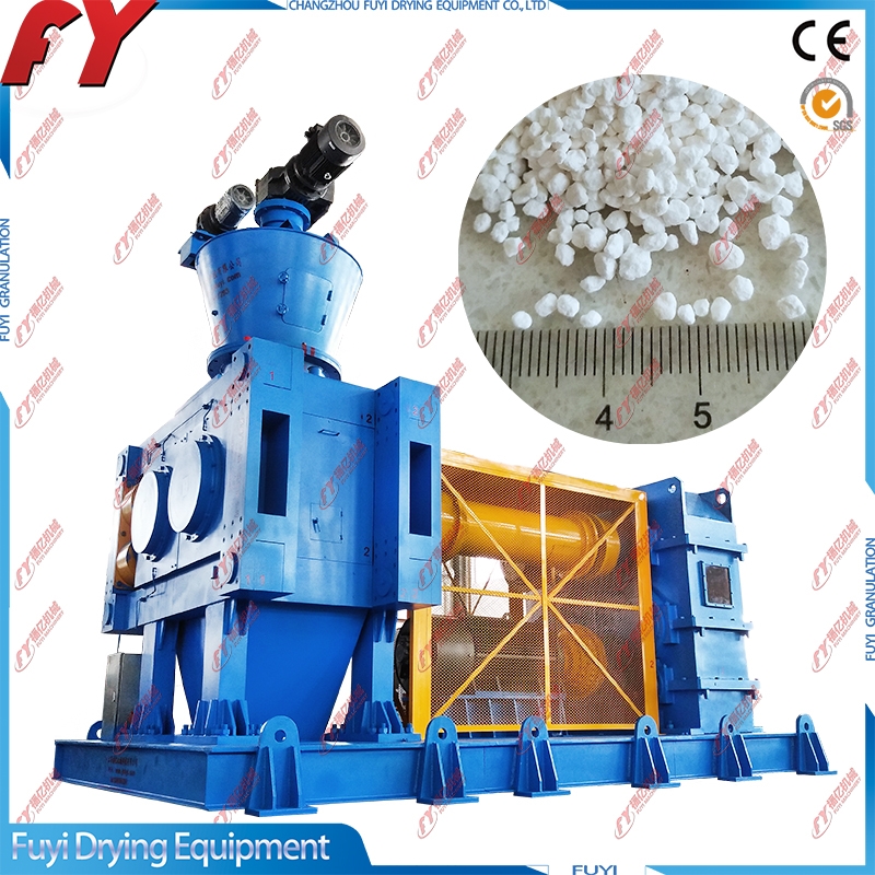 原料經定量加料器均勻送入喂料斗, 扎機利用帶有穴眼孔的成對軋輥,彼此留有一定間隙,兩者以相同的轉速作反向旋轉。其中一組軋輥軸承座在機架內不動,而另一組軋輥軸承座則在機架導軌上游動,借助液壓缸施壓使彼此緊靠。軋輥表面上有規則地排列許多形狀、大小相同的穴眼孔,且波谷對準波谷。而此時干粉狀物料從兩軋輥上方連續均勻地靠自重及強制喂料進入兩軋輥之間,物料先作自由流動,進入咬入區后被軋輥逐漸咬入波谷。隨著軋輥的連續旋轉,物料占有的空間逐漸減少而被逐步壓縮,并達到成型壓力^大值。隨后則壓力逐漸降低,所壓得之型塊因彈性回復加之自重而脫落穴眼孔而進入碎整粒、篩分裝置,所得成品為粒狀合格產品,進行過秤包裝。而粉料口出來的細粉料和不合格的超大顆粒則由返料絞龍重新進入提升機加料口隨同新鮮物料混合加入預加料斗而進入下一輪工藝流程。
