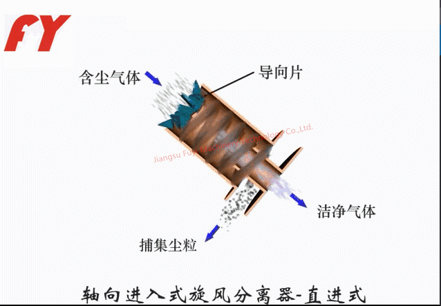 含塵氣體從入口導(dǎo)入除塵器的外殼和排氣管之間,形成旋轉(zhuǎn)向下的外旋流。懸浮于外旋流的粉塵在離心力的作用下移向器壁,并隨外旋流轉(zhuǎn)到除塵器下部,由排塵孔排出。凈化后的氣體形成上升的內(nèi)旋流并經(jīng)過(guò)排氣管排出。